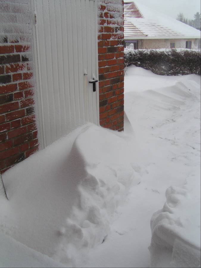 Heute Nacht hatte der Ostwind Schneewehen bis zu 1/2 m Höhe produziert, und auch die Fenster sind immer wieder zugeweht, kleine Gucklöcher sind vorhanden. Ein Bild von heute Vormittag, eine kleine Gasse wurde bereits freigeschaufelt, um das Fenster vom Schnee freizuräumen.