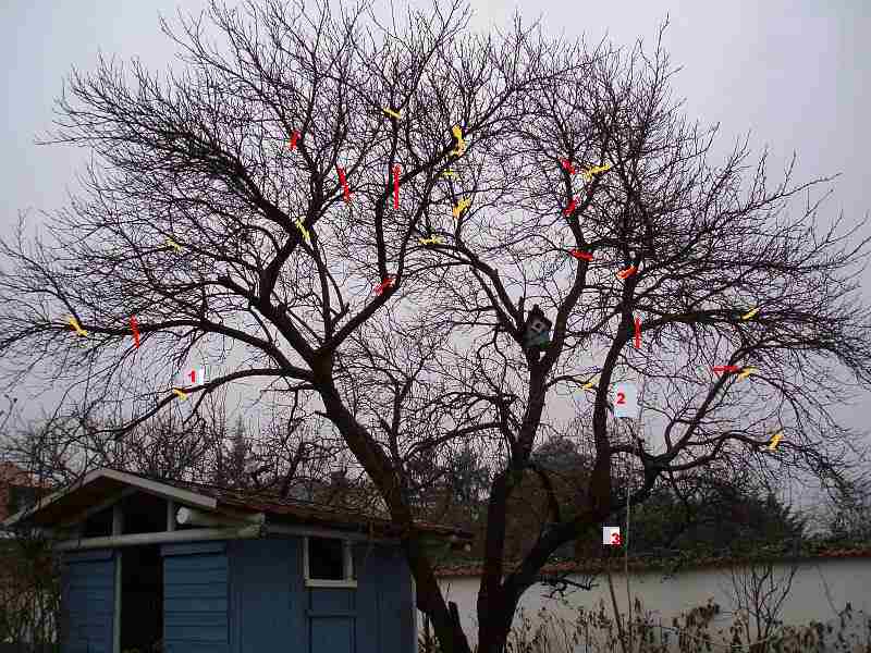 Ich habe an dem Bild "rumgemalt"...Ich denke das das soweit auch alles ganz ok ist, solange man nicht so sehr "rumschnippelt"ich habe folgende Änderungen hinzugefügt. Auf Ast Nr.1 würde ich aufpassen, nicht so stark zurückschneiden, weil er wegen dem darüber stehenden Ast beschattet wird und schon geschwächt. Bei Ast Nr.2 sieht man schon das er die Funktion eines Reiters übernimmt, er steht auf Ast Nr.3 Bei einigen Schnitteingriffen habe ich mehrere Schnitte eingezeichnet, das sollte verteilt über mehrere Jahre im Sommer geschehen. So kann man auch immer schön sehen ob der Baum an den demensprechenden Stellen gut reagiert.Man sollte auch darüber nachdenken entstehende Wasserschosse schon im Sommer, sofern sie richtig stehen, zu entspitzen und deren Verzweigung zu fördern.