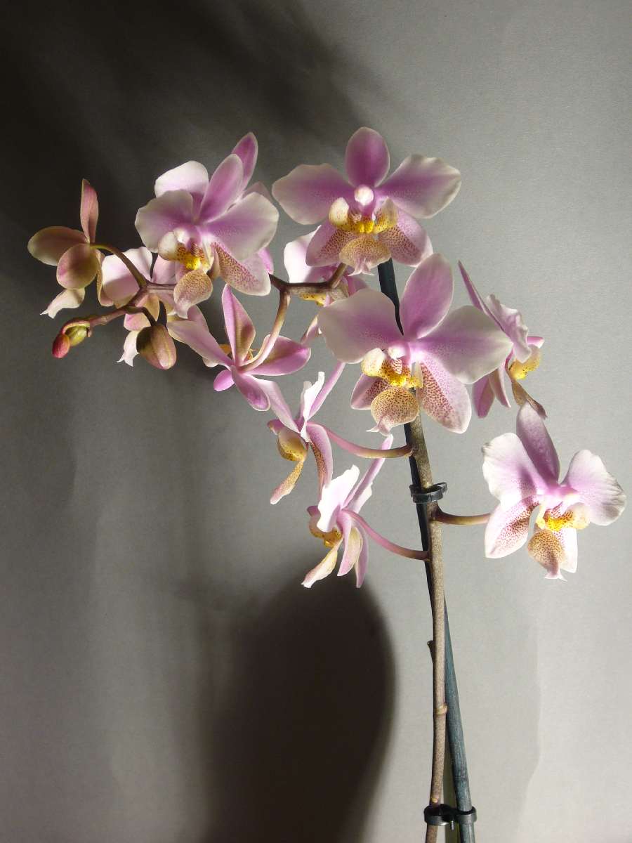 Eine Phalaenopsishybride aus dem Blumendiscounter musste ich die Tage mitnehmen, um etwas Farbe ins Fenster zu bringen. Ich halte sie für Phalaenopsis 'Wiganiae' (P. stuartiana x P. schilleriana)