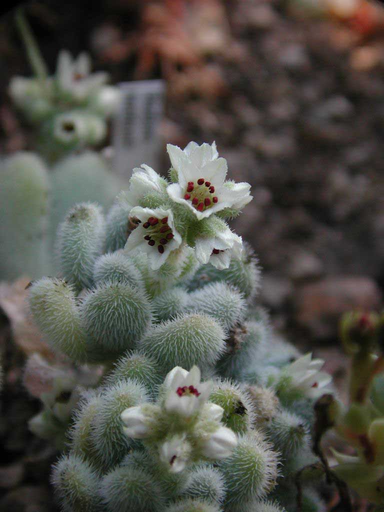 . Im Winter muß sie knochentrocken stehen, sonst fällt sie auseinander. Sedum caruleum ist der einzige blau blühende Vertreter der Crassulaceae. Leider ist die Art aus dem Mittelmeerraum nur einjährig, sät sich aber beständig aus, so dass auch die Kultur im Freiland an geschützter Stelle im Steingarten versucht werden kann. Unter Glas geht sie jetzt in Blüte, die wunderbar mit einer Rotfärbung des Pflanzenköpers kontrastiert