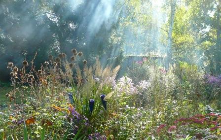 Du hast eine zauberhafte Lichtstimmung eingefangen. Kein Wunder, dass Jo gerne mal kommen würde, das Bild macht Lust dazu, diesen Ort aufzusuchen.Zugleich ist es etwas unbefriedigend, da man außer der Stimmung nichts "so richtig" sieht, es ist sehr viel drauf, aber es fehlt Gliederung, Ordnung. Vielleicht wäre es eine Möglichkeit gewesen, eine Staude in den Vordergrund zu nehmen oder aber eine Linie - z.B. einen Weg oder Rand des Beetes zur Gliederung zu nutzen.