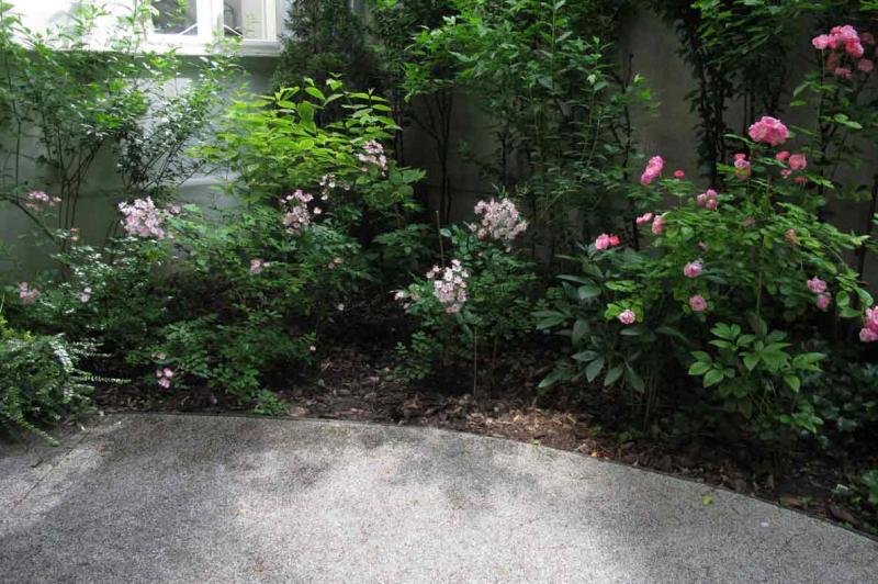 Jetzt wird es Zeit, diesen Thread hervorzuholen, denn in der Zwischenzeit hat sich da einiges getan. Vorausschicken muß ich, daß noch so manches ein Kompromiß ist, weil es schon ein paar Rosen gab, bevor ich sozusagen übernommen habe. Vor der Renovierung des Hauses und somit des Hofgartens vor vier Jahren standen sie in Kübeln und wurden auf Wunsch der alten Nachbarn in einer Art kleinem Rosenparterre gepflanzt. Leider wurde dafür nicht tief genug ausgegraben und es bleibt abzuwarten, wie die Rosen sich künftig entwickeln werden, zudem ist nach der Aufstockung nun noch weniger Sonne als davor.Es bleibt also ein Experiment, auch insofern, als ich peu à peu Schattenstauden zwischen die Rosen setze, um den Rindenmulch langsam abzulösen