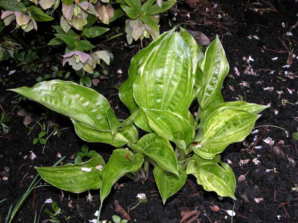 Hier habe ich zwei Hosta undulata 'Univittata', die ganz unterschiedlich im Austrieb sind. Eine steht sonnig, eine schattig.