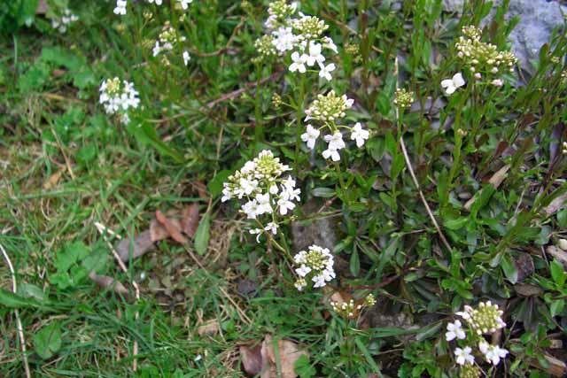 Vielleicht ist es Ungarische Gänsekresse arabis procurrens.Die bildet Blattrosetten aus und hat Wiesenschaumkraut-ähnliche Blütchen auf hohen Stengelchen.Auch noch so Zeugs an der Steinkante, was ziemlich dickblättrige Rosetten bildet und im Frühling leicht weiß/rosa Blüten hat, die ziemlich hoch rauswachsen und auf ganz dünnen, zarten Stielen schweben. Da wäre jetzt endlich auch mal der Name interessant. Ich glaube das habe ich sogar in Weiß und in rosa/rot.
