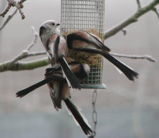 Seit etwa einer Woche geht das Körnerfutter fast gar nicht mehr weg, nur die Meisenknödel werden von den Spatzen und Meisen noch befressen. Seltsam. Wovon leben die jetzt?Am Wochenende habe ich wieder einmal einen größeren Trupp Schwanzmeisen gesichtet
