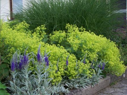 Die etwas höheren Stauden sind so gewählt, dass sie nach dem Rückschnitt remontieren (Salvia `Caradonna´, Artemisia `Valerie Finnis´, Alchemilla..). Es sind zwar keine ausgefallenen Stauden drin, aber es sieht wirklich ganzjährig und von allen Seiten gut aus.