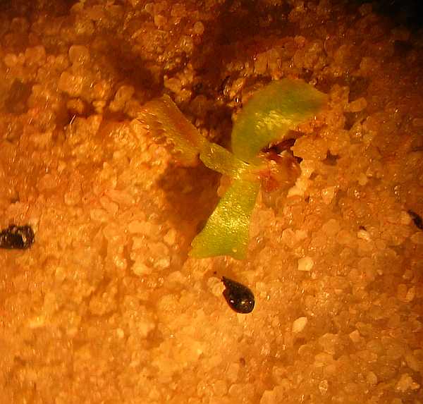 Meine Venusfliegenfallen keimen unter Kunstlicht diesmal besser als an dem Fenster.In der wirklichen Welt ist diese Pflanze 3 mm breit. Aber ich hab ein Binokular da machen sie schon was her.Da kann ich auch die kleinen kugeligen Rotalgen(?) beobachten.Aussaatsubstraat lebendes Sphagnum mit Quarzsand. Eine Abdeckung mit weißem Quarzsand. Bis jetzt mit einer 13 Watt Energiesparlampe beleuchtet Lichtfarbe 4000 kund einer Leuchtstofflampe Tageslicht. Dazu wird dieses Wochenende noch eine 33 Watt Energiesparlampe mit 6500 k Lichtfarbe kommen. Unter diesem Licht keimen auch Drosera Anglica zufriedenstellend. (Bis jetzt 11 Pflänzchen aus ca.70 Samen, erst ein Samen verschimmelt)Bei den Darlingtonien werd ich unter Kunstlicht wohl kein Desaster erleben wie letztes Jahr. Diesmal hab ich Samen von einer Mutterpflanze aus den Bergen in Oregon. Da sind bis jetzt 8 Samen verschimmelt (dead on delivery). Zwei haben gestern gekeimt die anderen sehen noch gut aus.Hat jemand Erfahrung mit einer USB Kamera um Mikroskopaufnahmen zu machen?