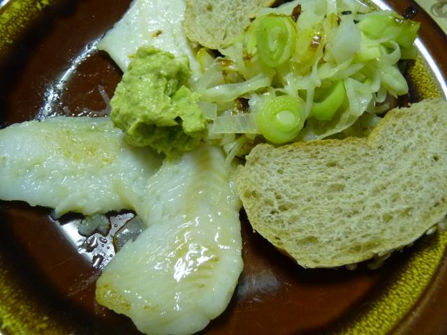 zum abend gab es fischfilet mit zwiebel-porree-gemuese und der restlichen avocado-creme vom mittag: