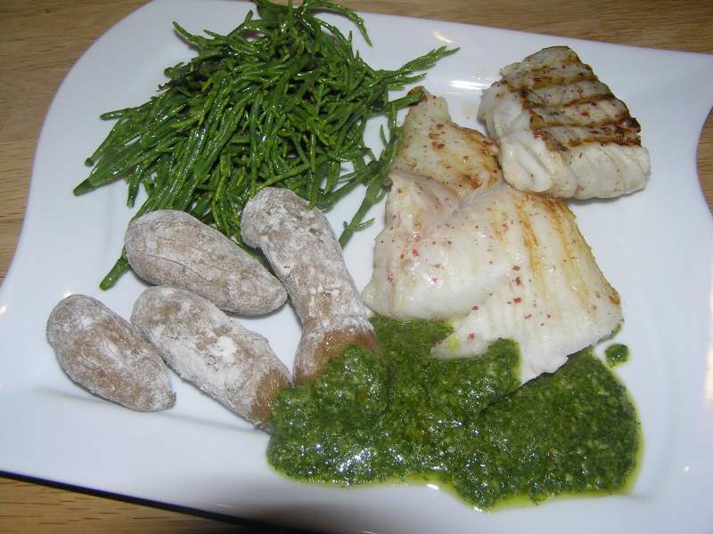 deswegen gabs heute heilbutt und seelachsloin mit kanarischen runzelkartoffeln (das nächste mal nehm ich weniger salz...), mojo verde mit petersilie und salicorn (eine algenart - sehr lecker, sehr knackig frisch