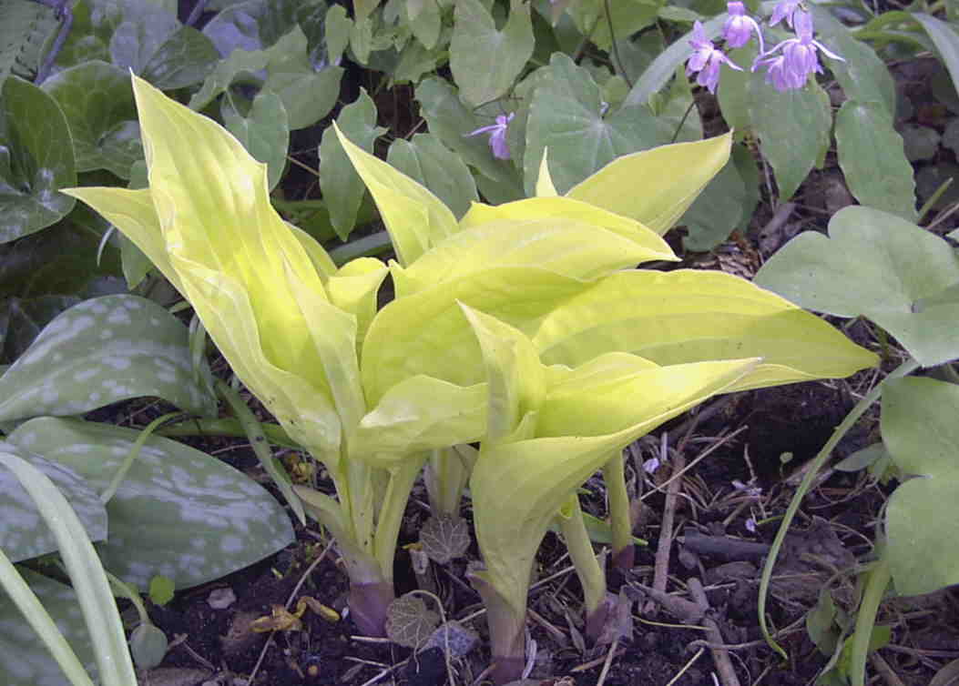 Noch im Austrieb ist 'Dresdner Gold'. Ist extrem goldgelb und behält fast übers ganze Jahr den Farbton. Ist die am meisten konstante gelbe Hosta die ich kenne. Bitte keine falschen Schlüsse - ich hab auch grüne und blaue "Hostien"