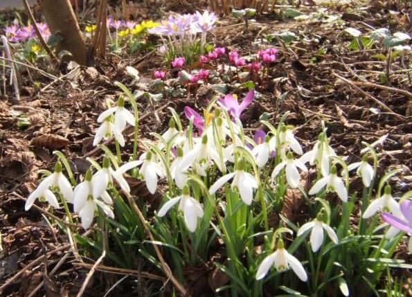 Letztes Jahr um diese Zeit war noch Schnee. 10 Tage später sah es dann so aus: Dieses Jahr blühen Winterlinge und Schneeglöckchen schon eine Weile, die Elfen-Krokusse lassen sich (in diesem halbschattigen Beet) noch Zeit und die Cyclamen coum sind nach drei Wochen Sonne, Wind und Dauerfrost vertrocknet. Dabei hätten dieses Jahr die ersten Sämlinge geblüht.