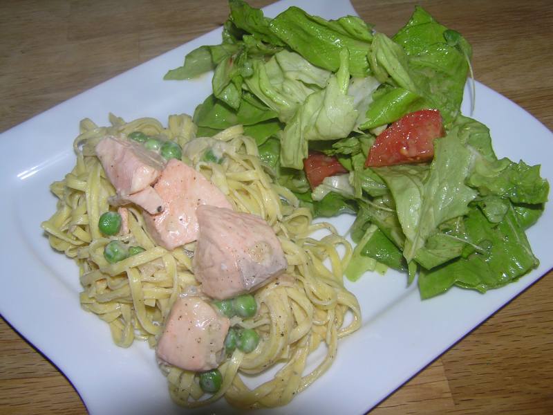 hier gabs gerade lachsnudeln mit erbsen, dazu salat.pappsatt!