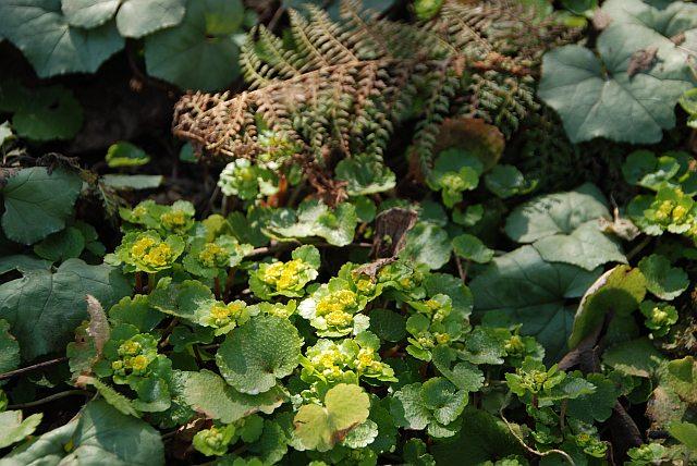 Ich dachte, davon mal eine Pflanze gehabt zu haben.Vorgestern beim Laubrechnen habe ich dann festgestellt, dass sie wohl doch nicht entgültig abgestorben war (wie im letzten Sommer gesehen), sondern sich wieder regeneriert hatte.Naja - jetzt hat sie nur noch 2 von ehemals 3 BlätternHeute ist eine der wenigen, nicht vom Frost in Mitleidenschaft gezogenen Blüten von Chrysosplenium macrophyllum aufgeblüht. Aber eigentlich sind eh die Blätter hübscher.