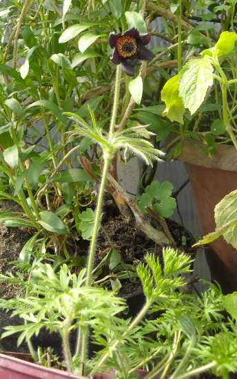 Zwei weißblühende Küchenschellen, die über Mittag von einem Weidenbäumchen beschattet wurden, entwickelten sich auch eher rückwärts...Erst als ich sie an einen Platz in die pralle Sonne gesetzt hatte, kamen sie in Gang.
