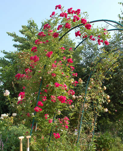 Hier noch eine Beschreibung der Gräfin:Multiflora-Hybride, Parkrose, Solitär, Spalier- und Heckenrose von ganz besonderer Wirkung. Winterhart bis in die äußersien Spitzen. Strauch aufrecht, buschig, Triebe bis 2 1/2 m in der Saison; Holz mit feinen Stacheln bewehrt, Laub groß, glänzend dunkelgrün, haltbar, gesund, nicht unter Mehltau und Rost leidend. Blume ziemlich groß, rund, kelchförmig, gut gefüllt, lange haltbar, in großen, breiten, mächtigen Sträußen aufrecht am alten Holze blühend, von Juni bis August. Farbe weithin leuchtend karmesinrot, duftend. Ein einzelner Strauss füllt eine Vase (The Farquar X Richmond). Österreich-Ungarns bedeutendster Rosenfreundin gewidmet.