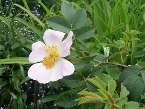 Hallo kat, zerreibe mal ein Blatt deiner Hübschen - wenn es fruchtig nach Apfel riecht, kann es eine R. rubiginosa, die Apfelrose, sein. Wenn nicht, ist es vielleicht eine R. canina, eine Hundsrose. Bei mir blüht seit vorgestern die R. pendulina (R. alpina). An den Bibernellen vergnügen sich bereits wieder die Blütenstecher