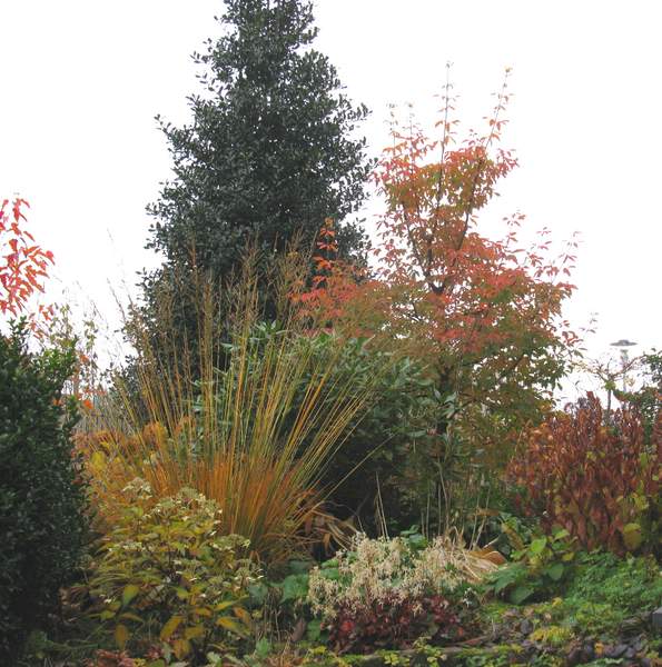 acer palmatum 'atropurpureum' läßt leider schon die blätter fallen. rechts der kleine ahorn ist acer palmatum *dissectum viridis', der sich hier gelb färbt.