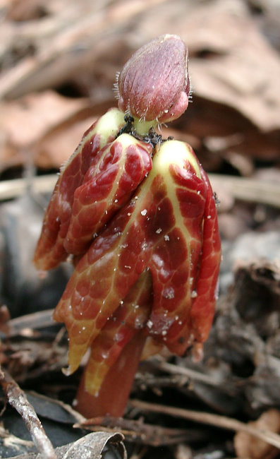 die nordamerikanische art podophyllum peltatum versteckt seine blüte schon beim austrieb zwischen den blättern. wenn sich die blätter später entfaltet haben hängt die blüte wie eine glocke unter den blättern versteckt in einer blattverzweigung. m.w. sind peltatum-blätter immer nur grün...oder kennt jemand peltatum mit marmorierten blättern, wie es die chinesischen verwandten meist zeigen?