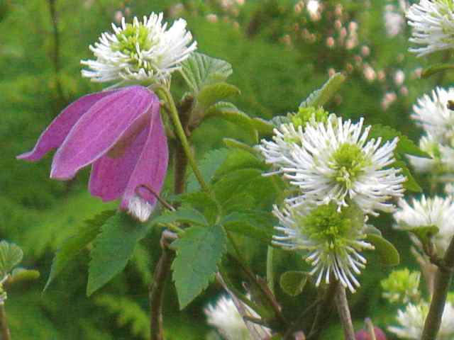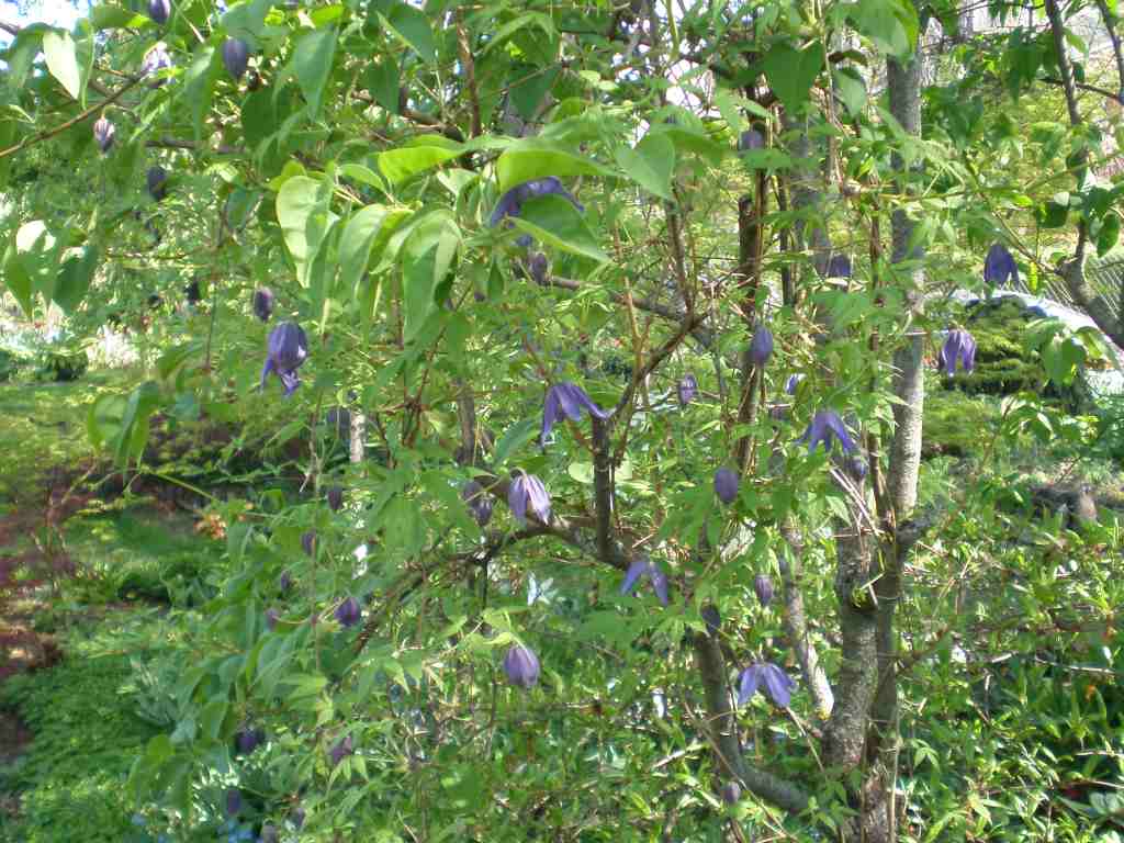 clematis alpina klettert in den weißen flieder, der leider seine blüten noch nicht geöffnet hat. aber es ist ja auch noch nicht muttertag.