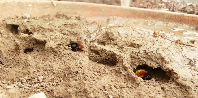 Dank der guten Hinweise von Cryptomeria/Wolfgang (Tiere im Garten) habe ich die feindliche Übernahme des Insektenhauses durch ein Ameisenvolk erfolgreich abgewehrt. Nun tragen die Mauerbienen fleissig Pollen und Nektar ein und schließen die Löcher wieder. Die Schale mit feuchtem Lehm, die direkt neben dem Insektenhaus steht, hat sich bewährt. Inzwischen haben die Mauerbienen ein regelrechtes Labyrinth hineingegraben.