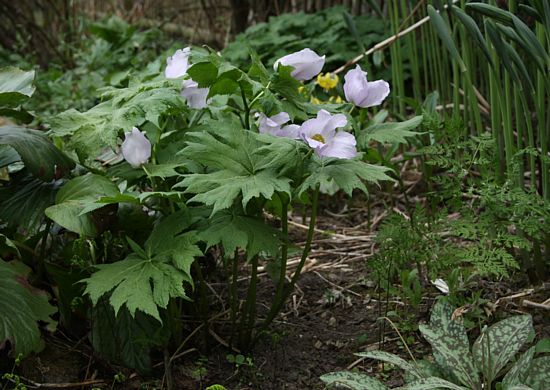 die blätter meiner anemonopsis macrophylla weisen auch nicht diesen metallischen glanz auf, obwohl sie eigentlich schattig steht. das letzte ausgetriebene blatt will sich nicht so recht entfalten, es sieht irgendwie nicht gesund aus. sie hat ja letztes jahr schon herumgezickt, ist dann einfach verschwunden und hat heuer wieder ausgetrieben. auf spätfröste werde ich achtgeben.mit cornus canadensis hab ich es mal probiert, ist aber sang- und klanglos verschwunden.