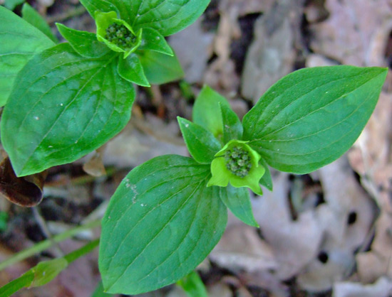 Dafür ist der Cornus canadensis schone in Stück weiter und schiebt die ersten Pseudo-Blüten.