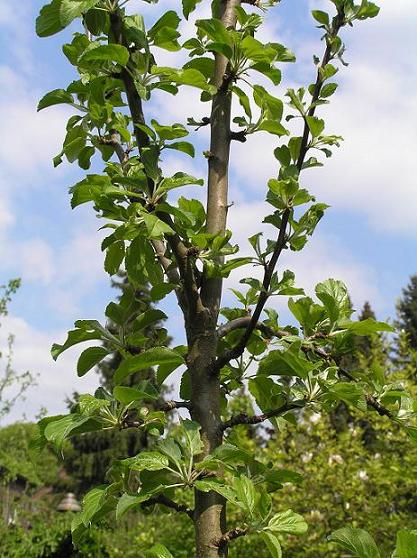 genau. und deswegen hier am säulenapfelbäumchen das gleiche bild: letztes jahr vollkommen überfordert mit elendig viel früchten, die kaum zu ernähren waren und eher klein blieben - dieses jahr nüscht, nicht eine knospe. soll er halt mal wachsen, der armselige strunk.