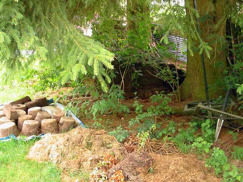 Nix, da, die warten nur noch drauf, von innen mit Schwimmbadfarbe gestrichen zu werden (sind total verrostet und verfärben das Wasser) die kommen unter die Dachrinne vom Gartenhaus-Anbau.Hier unter den Fichten muss ich auch aufräumen, da liegt einiges für den neuen Kürbishügel und die Bohnentipis muß ich auch noch mit Bindfäden bespannen: