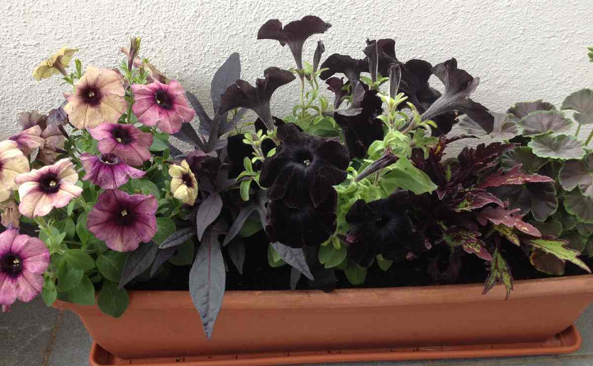 Dunkellaubige Ipomoea batatas, eine dunkle Buntnessel, eine schwarze Petunie und eine Blattschmuckpelargonie mit ebenfalls dunklem Laub habe ich mit der morbiden Petunie insgesamt düster kombiniert. Angeregt vom WGT in Leipzig.