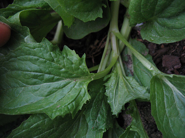 Hier auf diesem Bild sind die Blätter genau zu erkennen.Offenbar sind die Stängelblätter gestielt, die Hochblätter sitzend. Aber auch die ersten Blätter an der Basis sind sitzend.