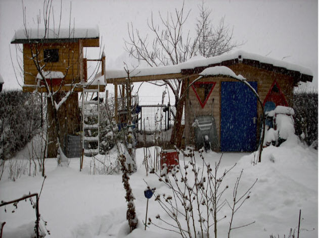 Köln, 60 m ü. NN; Der Garten ist bezuckert.1 cm Schnee. Immerhin, es sieht wie Winter aus.