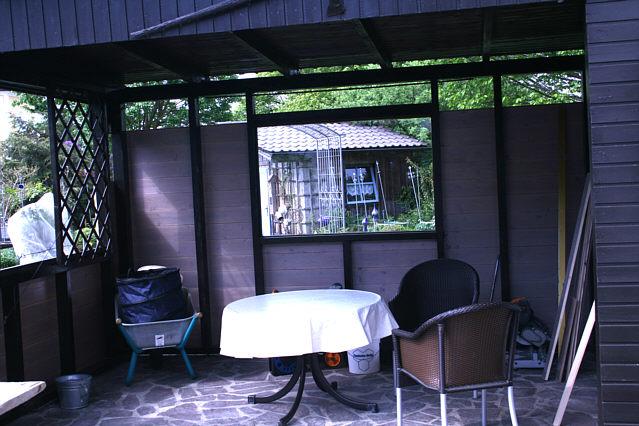 Hallo !Mein Sommerhäusl bekommt neue Außenbretter. Die alten waren schon 38 Jahre alt. Sie waren schon häßlich. Der Rahmen und der Himmel sind dunkelbraun und bleibt stehen. Die Außenbretter bekamen eine andere Farbe. Wir haben heute angefangen die alten wegzumachen und die neuen hinzuschrauben. Es macht viel Arbeit, aber dann wird´s wieder schön.lg. elis
