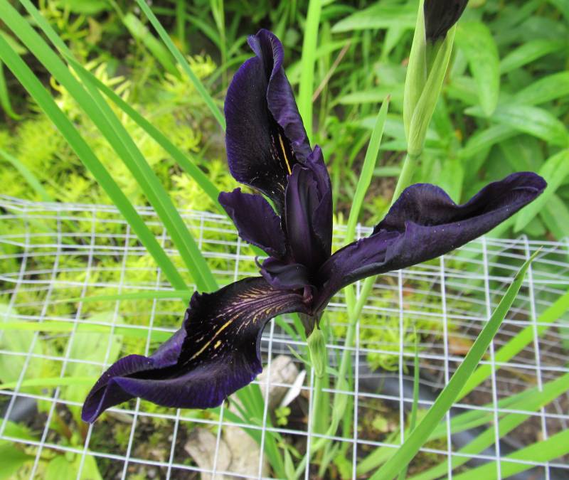 Nun blüht Iris chrysographes 'Black Form' zum ersten Mal in meinem Garten. Ich bin schwer begeistert von dieser schönen Blüte.Sie steht in meinem kleinen Moorbeet, das ich wegen der Amselattacken gegen das eh nur mehr spärlich vorhandene Sphagnum mit Drahtkorb schützen mußte.