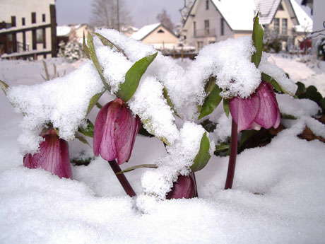 Pustekuchen! Wir haben hier ausnahmsweise mal Winter - und trotzdem Blüten! Ist doch hübsch wie der Schnee von den Blättern gehalten wird und die Blüten frei bleiben.Leider mußte ich blitzen, das bischen Sonne reichte nicht.
