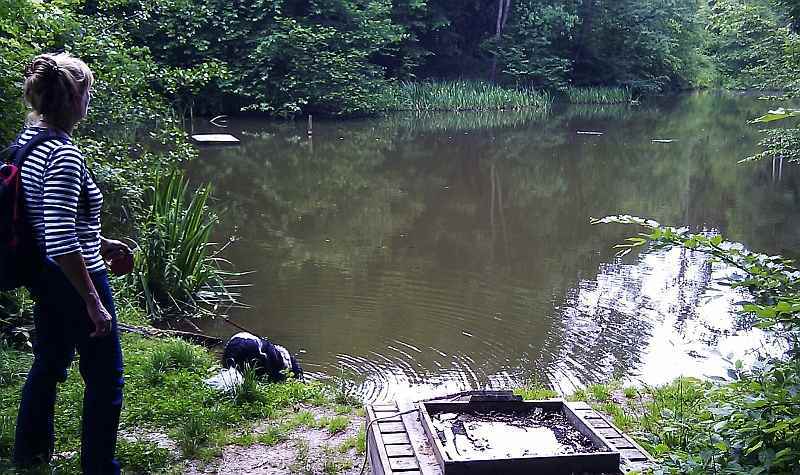 Shiva ist wirklich ein/e Diva/ Divo (dekliniert man das so?)... Star, genauso, wie Nikita, Aksunai scheint gut ausgelastet und von Soxs, auch wenn es soooo viele seiner Art gibt, jedes Individuum ist doch eine einzigartige Persönlichkeit, oder, egal wieviel andere es gibt, die auch so aussehen, oder? Foddos, büdde!Bei Shiva wundere ich mich immer, wie groß der Unterschied zu Dickies Busenfreund Lando ist, auch ein Tibet-Terrier, weiß mit weinig schwarz, wird aber jedes Frühjahr geschoren, er sieht wirklich wie eine ganz andere Hunderasse aus, ist schon interessant, was das Scheren (von fundamentalen Tibi-Haltern nicht unbedingt bevorzugt) ausmacht, auch der Charakter scheint sich jedes Mal zu ändern, von langhaarig-grimmig zu kurzhaarig-unbeschwert-lustig. Ganz witzig, dass er nach dem Scheren immer jedem gleich mit seinem frisch geschorenen Pöppes umschmeichelt und ihm den entgegenstreckt, ganz ulkig, diese Verhalten gleich nach dem Scheren.Wir waren am Wochenende wieder in Geocaching-Mission unterwegs, da die Strecke deutlich mehr als 10 km lang war, haben wir für den den 16-jährigen Hunderentner seinen Schiebewagen mitgenommen, meist ist der Oldie gut mitgelaufen, wenn es anstrengend für ihn wurde, konnte er den Schiebedienst nutzen.Hier hat er an einem schönen Weiher mit gelben Sumpfschwertlilien ausgiebig geässert: