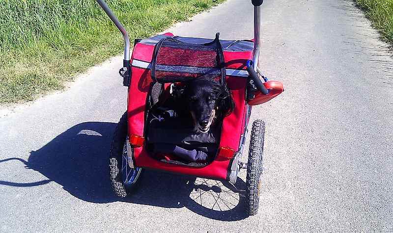 Und Dickie wurde auch am nächsten Tag rund um den Ort Strinz-Trinitatis beim Rückwärtsfahren nicht schwindelig, leider verpasste er dabei etwas von der wirklich wunderschönen Landschaft dort ...Hier im Bild geht es über schön befestigte Wege, viele Kilometer vorher sind wir über Wiesen- und Waldwege gerumpelt, das hat der Alte gur weggesteckt, irgendwie hat er begriffen, dass dieses Gefahrenwerden nach einiger Zeit eine enorme Entlastung für ihn ist, immer hat er ums Verrecken versucht, uns hinterherzulaufen, wahrscheinlich würde er es bis zum Tode versuchen, Verlassensängste seit Tierheimtagen vor mehr als 15 Jahren, aber das sitzt tief drinnen, so kann er jetzt, auch wenn das als Gehbehinderter Rentner nicht mehr ganz so fluppt, immer dabei sein und ich glaub, er hat das begriffen und findet die Hundekarre wirklich gut, ich warte nur darauf, dass er sich davor stellt und in seiner ihm eigenen Art kläfft "ey, ich will da jetzt rein!"Eine Art römisches Wagenrennen hatten wir am Wochenende auch schon, wir sahen ein Reh, das über den Weg vor uns wechselte, und der Hund in der Karre kläffte lauthals nach dem Motto "Menno, Leute, schneller, schneller, wird´s bald, den kriegen wir, los, zackig....!"
