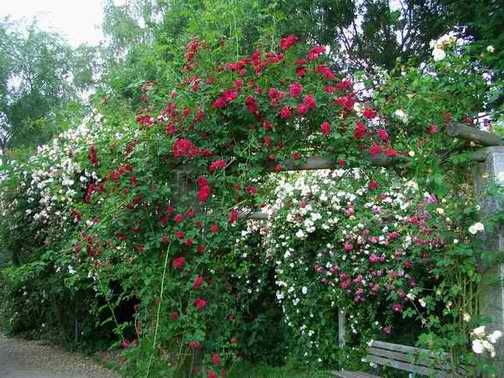 ...'Mme Alfred Carrière' wurde schon genannt, müsste in Zone 8a von Rechts wegen mit gelegentlichem scharfem Ostwind klarkommen. Wenn es auch ein wenig "wild" sein darf (und mit späterer, dafür langer Blütezeit), wäre die unkaputtbare, weiß ungefüllt blühende Rosa moschata eine Möglichkeit. Auf andere Art hinreißend in Weiß: 'Mme Plantier', die auch klettern kann und dann locker 4-6m schaffen soll (sagt jedenfalls Beales - ich kann's mir gut vorstellen); sie duftet herrlich. Eine aparte Rote, deren leuchtende Farbe durch die helle Blütenmitte besänftigt wird, ist 'Hiawatha' ; in zwei Wochen kann ich dir sagen, ob die Fotos der Realität entsprechen, spätestens dann müsste meine die ersten Blüten offen haben - wüchsig ist sie jedenfalls (üppig verzweigte 2m im zweiten Standjahr trotz ungünstigen Platzes an einer Birke). Und in Rosa wächst bei mir die Climbing-Form von 'Mlle Cécile Brunner' in den Himmel (Achtung, das Foto zeigt die Strauchform! - Blüten sind hier wie dort gleich edel & zierlich), die überdies den ganzen Sommer immer mal wieder blüht. Mademoiselle und R. moschata brauchen früh gute Lenkung, sie haben steife Triebe. Und Vorsicht, sie sind sehr stachlig