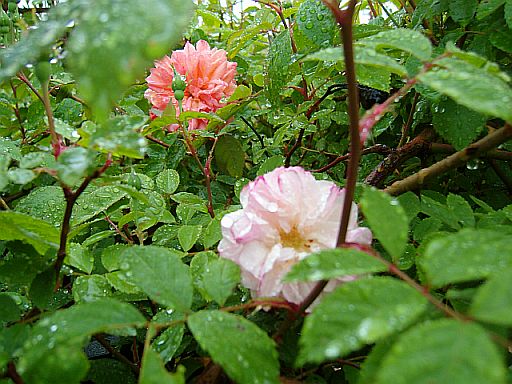 Ich erinner nicht, dass ein Rambler schon mal so früh geblüht hat. Im Hintergrund Paul Noel, vorne Venusta Pendula, die dies Jahr einen schönen farbigen Rand hat.