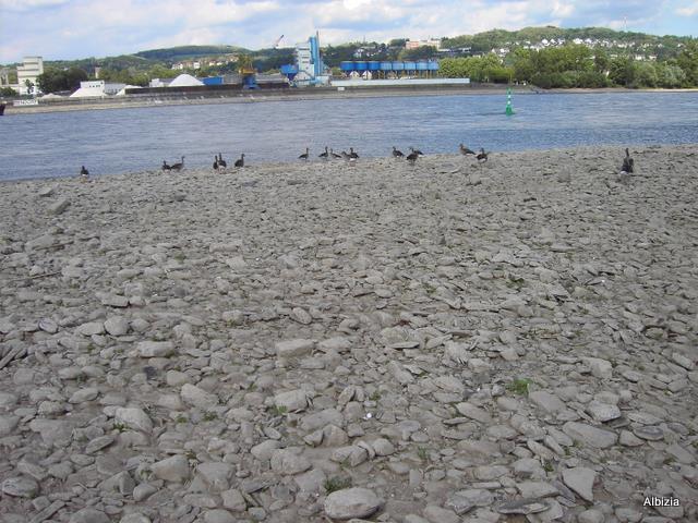Geregnet hat es hier gerade eben 5 Minuten. Jetzt scheint die Sonne schon wieder aus allen Löchern.Der Rhein hat, wie viele Flüsse, nur noch wenig Wasser. Mal ein Blick auf trocken gefallene Steine am anderen Rheinufer: