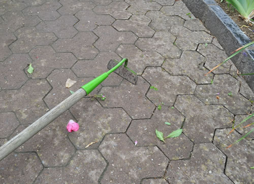 Hier sind die Steine sehr uneben, schwierig mit der Hacke darüber zu fahren. Kurzerhand liess ich alles stehen, was mir gefiel, ja half sogar noch etwas nach. Geht auch gut zum darüber wischen.