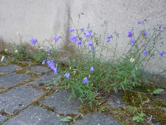 Fugengarten: Campanula rotundifolia (?) und Erigeron karvinskianusKennt zufällig jemand die Glockenblume? Ich hab sie mal von der Streuobstwiese ausgebuddelt und in den Garten gepflanzt, weil sie rund ums Jahr blüht. Seitdem tauchen immer wieder mal Sämlinge auf.