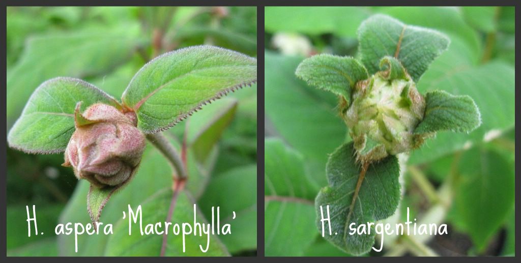 Für alle, die sich noch nicht sicher sind, welche der beiden häufigsten Samt- bzw. Rauhblatthortensien sie im Garten haben, habe ich mal die Knospen gegenüber gestellt.Beide blühen bei mir gleichzeitig. Mit Merkmalen wie Laubform und -größe oder Behaarung habe ich manchmal auch so meine Schwierigkeiten, besonders, wenn die Pflanzen sonnig stehen.'Mauvette' und 'Peter Chapel' sehen in der Knospe übrigens der 'Macrophylla' sehr ähnlich, was für mich auf eine ähnliche Abstammung bzw. Zugehörigkeit hindeutet. Sie blühen bei mir jedoch etwas später.Die Knospen der H. aspera subsp. robusta von Esveld sind bereits deutlich weiter als die beiden (Foto folgt). Die Knospen von H. vllosa, H. strigosa (Ja, sie wird wohl auch blühen