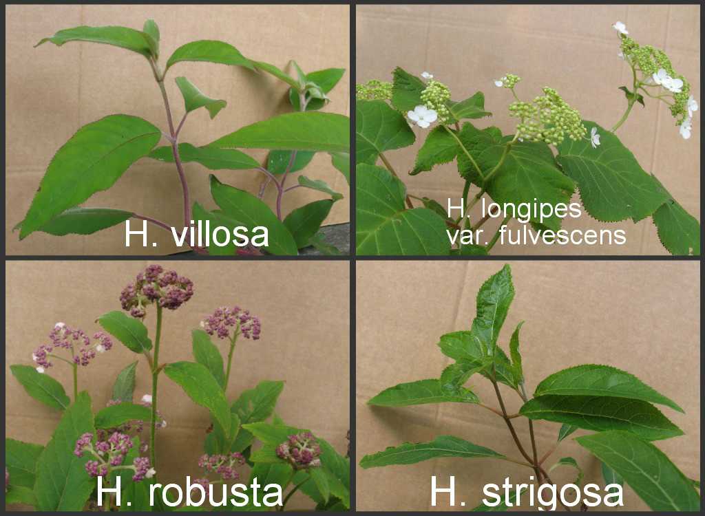Hier noch ein Vergleichsfoto von meinen Pflanzen, die als "Formen", in Sichuan nebeneinander vorkommen könnten.Am ähnlichsten vom Laub her sind sich H. villosa und H. robusta.H. villosa hat jedoch rote Blütenstängel, wächst lockerer und blüht bei mir seit Jahren erst Ende Juli mit sehr großen Blütenstständen, während H. grüne Blütenstängel hat, dicht verzweigt ist und deutlich früher mit kleineren Blüten blüht.Bei H. strigosa kann ich die Blütenknospen gerade erahnen. Die späte Blütezeit wird auch oft als besonderes Merkmal dieser Form hervorgehoben. Das Laub und die Behaarung der Blütenstängel unterscheiden sich hier wie auch bei H. longipes var fulvescens völlig von den beiden anderen Formen.Zwischen H. robusta und H. longipes var. fulvescens ('Elegant White') kann ich abgesehen von der frühen Blütezeit eigentlich kaum Gemeinsamkeiten erkennen, obwohl H. robusta und H. longipes von vielen Autoren H. aspera subsp. robusta zugerechnet werden.