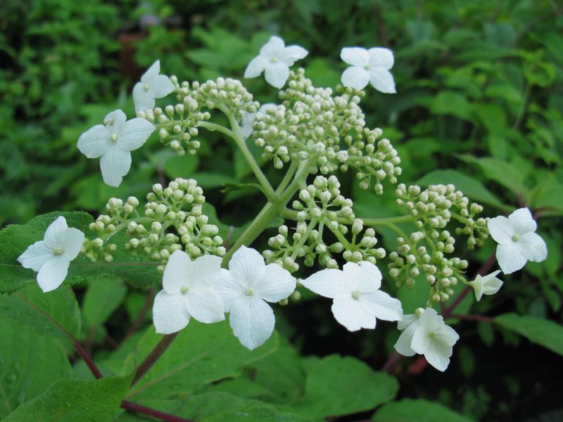 Langsam aber sicher kommen die zarten Blüten von Hydrangea serrata auch im Garten. Hydrangea serrata Mont Aso.