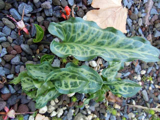 ..Übersetzt: Arum mit Nachbarschaften ;DEine meiner Lieblingspflanzen im Winterhalbjahr ist Arum italicum var. pictum. Der Name ist oft auch anders. Welcher momentan korrekt ist, weiß ich nicht.Die Pflanze hat das komplette Winterhalbjahr schöne frischgrüne marmorierte Blätter. Nebendran liegt noch ein Rest des orangenen Blütenstandes. Im Sommer ist die Pflanze eingezogen.Edit: Thema mit Arum-Thread zusammengeführt. ;)Ph.