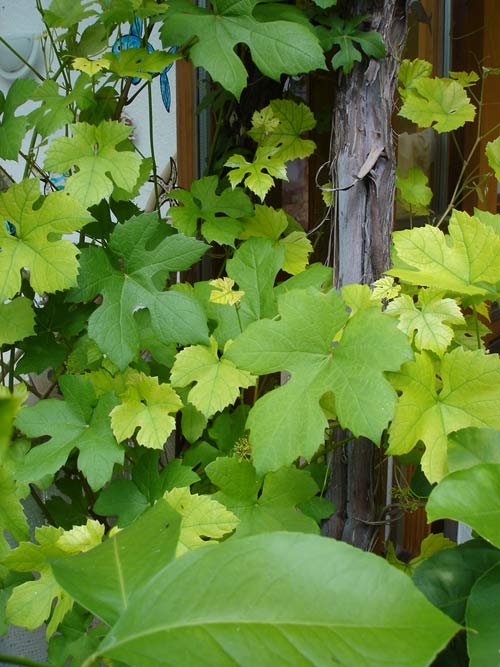 Das vergeht von selbst wieder? Mein anderer Weinstock und die in den Nachbargärten sind alle viel dunkler. Ich habe auch den Eindruck, daß diese Erscheinung von Jahr zu Jahr ausgeprägter wird.