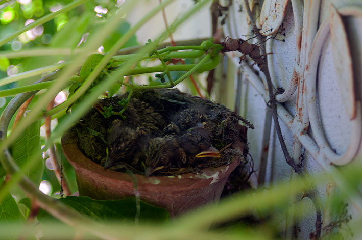 Hier haben sie auch schon in den Rosen am Spalier vorm Haus genistet und früher im Efeu direkt neben der Gartensitzecke. Und fast hätten wir beide Male nichts davon mitbekommen.