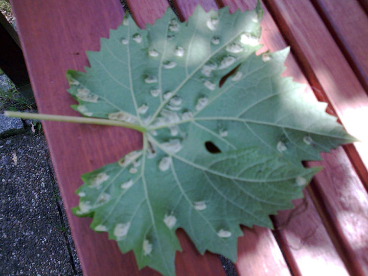 Hi zusammen,...kann mir jemand sagen, was mein (echter) Wein hat?Er bekommt es jedes Jahr. Von oben sehen die Blätter aus wie als hätten sie Dellen, von unten sind Einbuchtungen mit weißem pelzigem/pilzigem Belag.Versuch jetzt mal Bilder reinzustellen...Das von unten ist nicht bersonders gut... es sind keine Woll-oder Schmier-Läuse, sondern Eindellungen mit weißlichem pelzigen Belag...LGSorcha