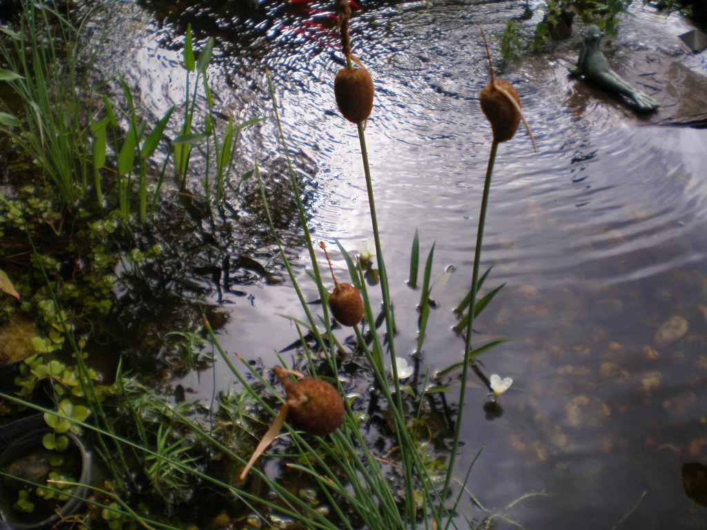 Schließlich habe ich gesündigt und Goldfische eingesetzt, die sich auch vermehrten. Sie werden aber nicht gefüttert und nützen indem sie Algen abweiden, und da es kein Perpetum mobile gibt, müssten sie eigentlich mehr fressen als ....Das Pfeilkraut konnte ich übrigens nicht identifizieren, also abwarten, ob die Pflanzen blühen.