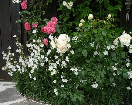 das kleine Rosenbeet vor einer Hütte gefällt mir nicht mehr- inzwischen wirkt es für mich unruhig und trotzdem fad.Im Hintergrund wächst Bobby James bis zum Dach, links davon ist Rosarium Uetersen bei einer Höhe von ca. 1 Meter und im Vordergrund Lions Rose und dazwischen die vielen weissen Glockenblumen . Die Glockenblumen sollen raus - aber was als Lückenfüller nehmen ? ich dachte an Gräser , einfach grün in grün um zu beruhigen oder wisst ihr etwas anderes ?das Beet liegt südöstlich und hat bis zum frühen Nachmittag Sonne , Boden humos